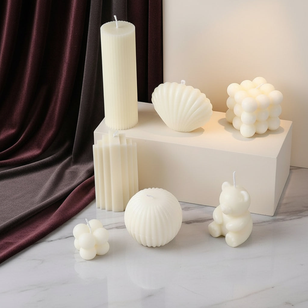 Design unique et original : Chaque bougie présente une forme créative, allant du Rubik’s Cube au coquillage, en passant par des formes douces et organiques comme la boule torsadée et la poire.